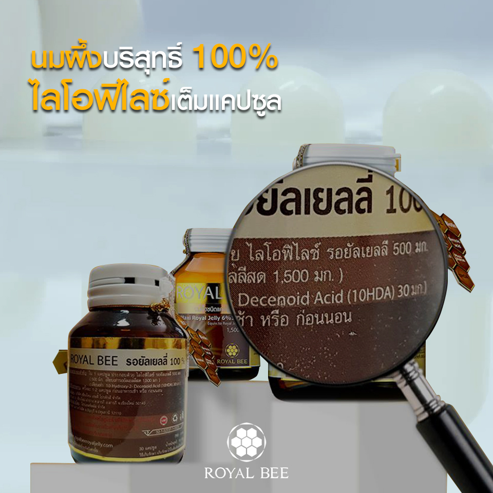 “หัวใจของนมผึ้ง” อยู่ที่ปริมาณ 10-HDA ดังนั้นไม่ว่าจะกินนมผึ้งเม็ดใหญ่แค่ไหน แต่ปริมาณถ้า 10-HDA มีน้อย ก็เท่ากับว่าแทบไม่ได้ประโยชน์อะไรจากการทานนมผึ้งเลย ในปัจจุบัน นมผึ้งที่มี Lyophilised สูงสุดคือ “Royal Bee ที่มีปริมาณนมผึ้งไลโอฟิไลซ์ออยู่ที่ 500 mg และ 10-HDA 35mg”